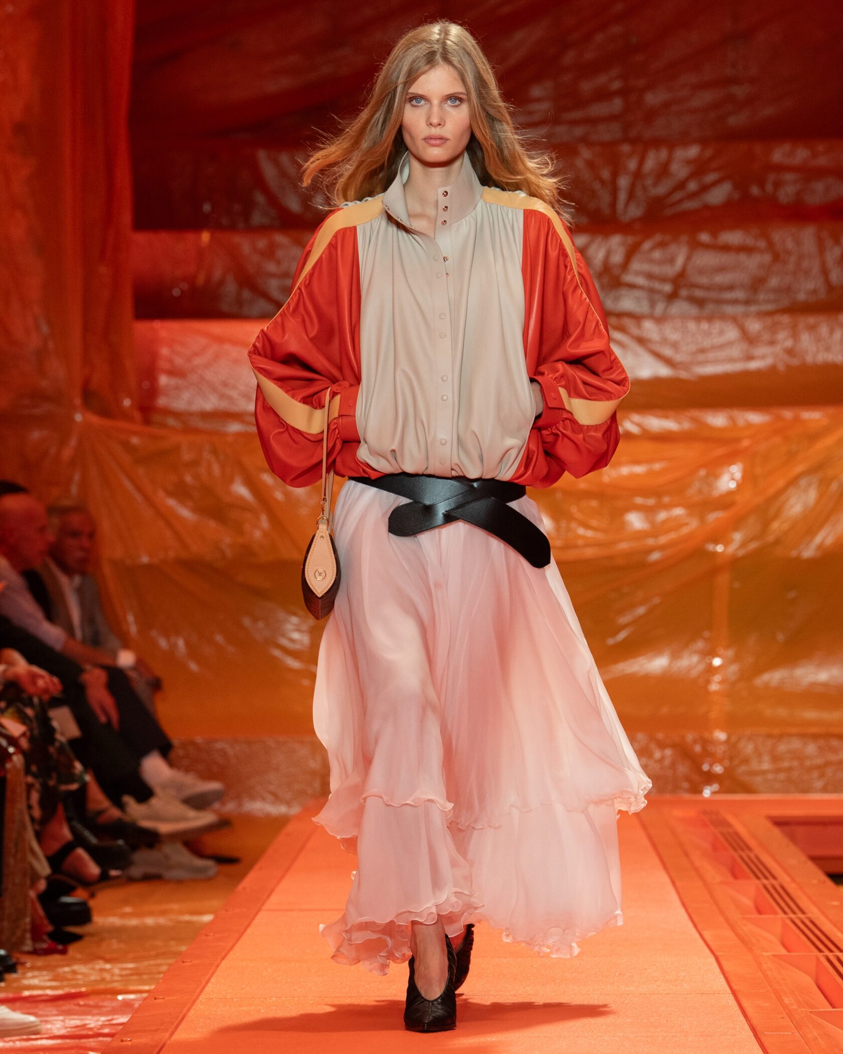 Яркие изделия коллекции, украшенные графическими полосками и сложными мотивами, сочетают в себе квинтэссенцию парижской моды и винтажного стиля. Николя Жескьер играет с многослойностью, создавая воздушные и приталенные силуэты, каждый из которых отражает разные грани женственности. Образы дополняют широкие пояса и эффектные аксессуары, украшенные стразами.